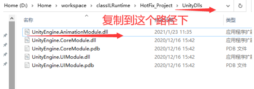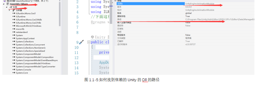 当我们开发游戏逻辑的时候,使用了Unity的那些库,只要从我们Unity的引擎里面找到这些.dll,然后复制到UnityDlls下面,然后添加引用到热更项目工程就可以了(这样你在热更项目就可以尽情的使用Unity的API,而且还是C#的)。如何找呢?有个小技巧,你打开标准的Unity项目工程,在” Assembly-CSharp”这里的引用就能看到我们使用的Unity的.dll, 例如我们要使用动画播放组件Animation, 它在UnityEngine.AnimationModule.dll里面,你就可以复制路径,找到这个.dll,然后把这个.dll拷贝到”逻辑热更项目”的UnityDlls里面,然后在逻辑热更项目中添加这个.dll的引用。