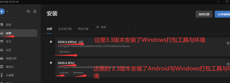 从Unity Hub安装与引擎版本对应的JDK, NDK,SDK,我只要打开Unity Hub,点击”安装”,Unity Hub就会帮你列出目前你安装的所有的Unity版本以及每个Unity版本安装了那些平台的打包工具,如图所示: