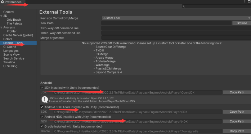 正常情况下,直接下载当前Unity 版本编译Android需要对应的JDK, NDK, SDK都可以安装好。如何都安装好了,我们打开Editor/Preferences菜单, 在External Tools,能看到Android这一栏,JDK,NDK,SDK是否都安装好了,如果安装好,就没有警告,如果没有安装,就会有黄色的感叹号。