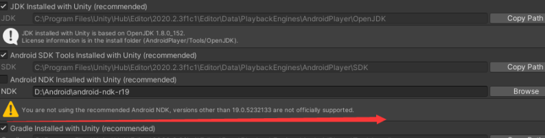 修改完成后,你再回到上面的External Tools,你发现还是提示这个问题,这个问题需要把NDK放到Unity默认的路径下,所以我们拷贝默认路径,进入对应的目录,如果没有NDK文件夹,新建一个NDK文件夹,然后把之前下载的NDK文件移动到这个文件夹下,即可。这样Unity编译Android要用的JDK, NDK, SDK都全部安装好了,黄色感叹号的警告提示也没有了。