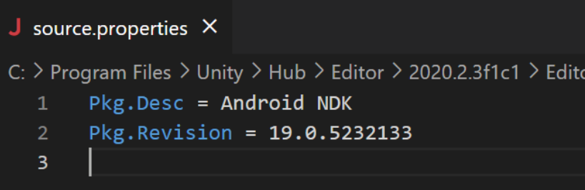 概率会更大一些。如果下载失败了,这个时候,我们就需要手动安装,我们拿NDK下载失败举例,我们可以在网络上下载一个NDK,那么这个Unity NDK的版本如何看呢?我们可以去掉Android NDK Installed with Unity 这个勾选框,选一个NDK的文件夹,如果NDK的版本不匹配,就会提示你它需要的对应的NDK的版本号, 如上图为19.0.5232133, 这个时候我们就可以到网络上去下载大的版本号为NDK 19的版本。NDK 大版本下载下来以后,小版本不一定能对上号,可以去找对应的小版本,也可以修改下载的NDK的版本号,打开NDK文件夹下的source.properties文件(用记事本等文本编辑器打开),如图,直接修改版本号为要求的小版本号(19.0.5232133)。