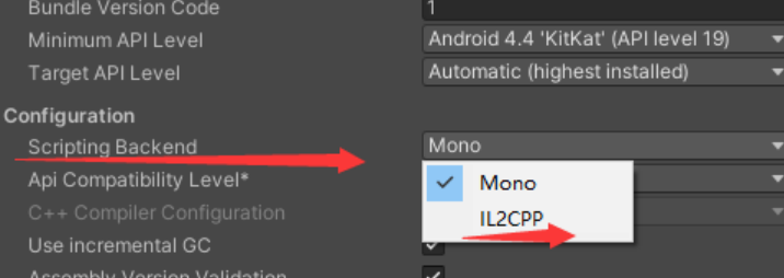 (3) Unity 打包的时候选择mono还是IL2CPP;