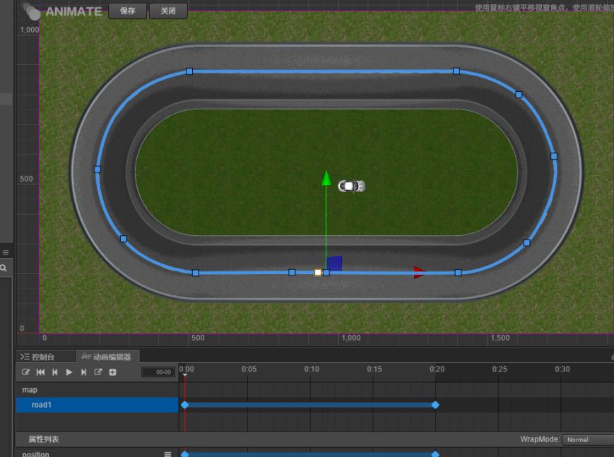 使用动画编辑器,来编辑road1的动画路径,生成一条曲线的路径;