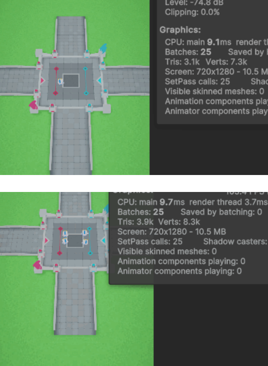 先看一下案例的效果,第一个gif是我们基于DOTS 放的一个entity的时候,stats性能参数显示,Batch是25。第二个gif我们放了4个entity,每个entity的动画都是独立不同的,我们再看stats的性能参数Batch还是25。