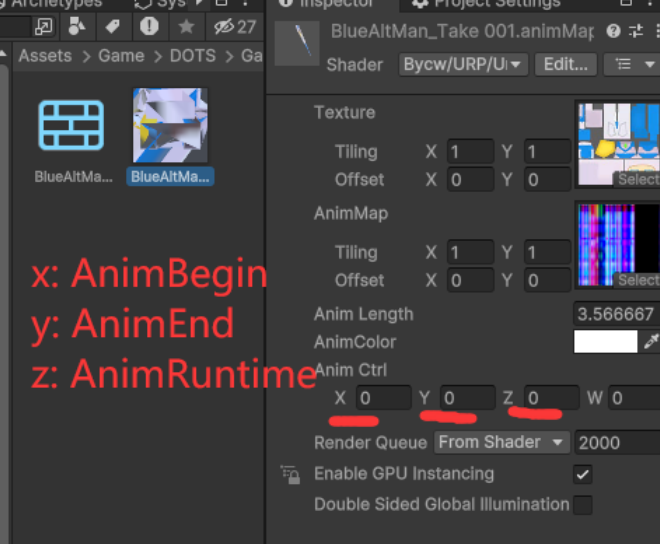 最近在做DOTS的教程,由于DOTS(版本1.0.16)目前不支持角色的骨骼动画,我们是将角色的所有动画数据Baker到一个纹理里面,通过修改材质中的参数AnimBegin,AnimEnd来决定动画播放的起点和终点,材质参数AnimTime记录当前过去的动画时间。但是在做大规模战斗控制的时候,有10000+的小兵在战斗,动画控制的时候,如果通过修改材质参数,来切换每个角色的动画。想要让角色之间的动画控制彼此独立,就必须要求每个角色有不同的材质对象,这样会导致10000+的小兵由于使用了不同的材质,无法通过GPU Instancing合批。问题的关键是我们要找到一种方法,让10000+的小兵使用同一个材质对象,同时动画控制相关的参数要基于渲染Instance独立。DOTS机制下我们找到对应的方法,于是写下这篇文章记录一下,让大家做DOTS动画与性能优化的时候少走弯路。