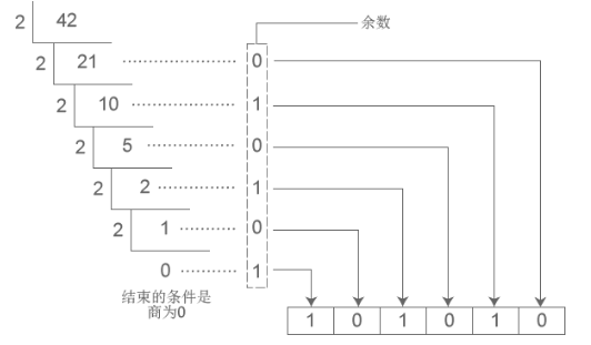 下图展示如何将十进制42转换为二进制数: