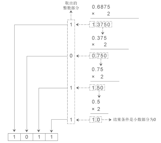 下图展示如何将十进制小数0.6875转化为二进制小数的过程: