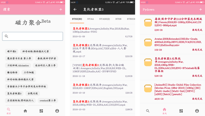 支持平台:Windows、安卓、iOS、网页请关注微信公众号:晓皎藏宝图,后台回复「黑科下载器」,即可获取下载链接。别回复错了,不是「黑科技下载器」,也不是「黑客下载器」。由于篇幅有限,具体请看:黑科下载器 | 在线秒播 BT 种子磁力链接,完爆迅雷边下边播Pydown(皮一下)——吊打迅雷离线下载Pydown 主要是解决后两个需求的:蓝光 4K 电影、盗版单机游戏。要是愿意少吃一顿外卖,下载正经电影、不正经电影也不在话下。那么何为离线下载?简单说,软件先通过服务器下载资源,再把下载好的资源传给我们,以此达到加快下载速度,减少下载时间的作用。以前晓皎我年少无知的时候觉得离线下载貌似没有什么用啊,估计服务器下载速度也比我电脑快不了多少吧!然而在晓皎用过之后,才知道我有多年轻,自己下载几天都下不完的资源,服务器几分钟就下载完了。Pydown 秒离线演示既然是离线下载就来个狠的,直接演示离线一部 100GB+ 的 4K《阿凡达》。晓皎直接把磁力链接放出来,谁要是能在有生之年用迅雷把一部 100GB+ 的 4K《阿凡达》下载下来,我跪下来唱《征服》。磁力链接:magnet:?xt=urn:btih:3b68e98ec4522d7a2c3dae1614bb32d3e8a41155