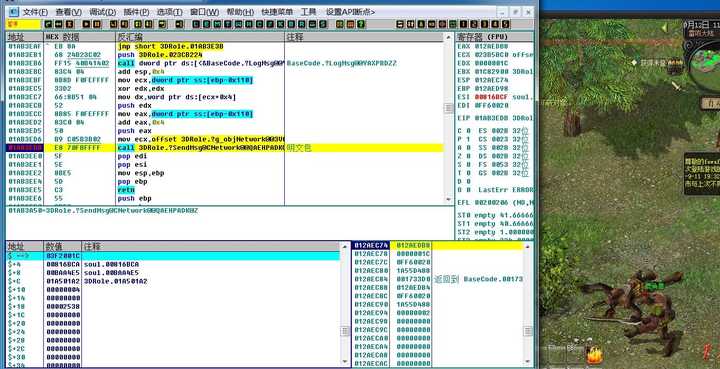 对于这种功能,首先想到是修改封包来尝试。这款游戏调用的发包函数为send,属于线程发包,在封包内容上下写入断 可以轻易跳出线程,返回到封包加密解密以及明文封包的位置。对技能封包的分析如下