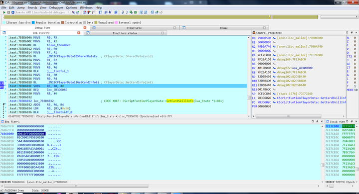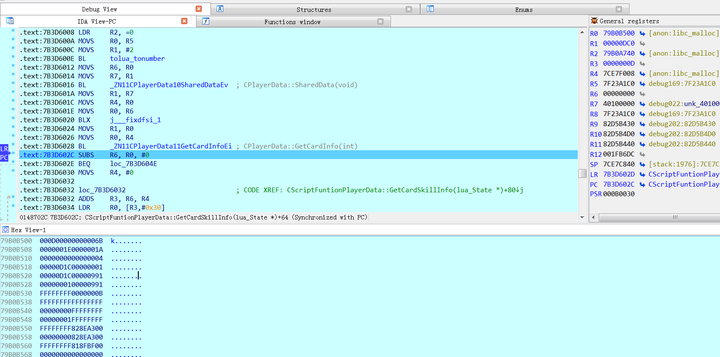 我们在GetCardInfo上下断,观察参数和返回值,得出函数传入两个参数,其中R0为固定的地址,而R1则随着卡牌的获得顺序发生变化。函数执行完会返回一个卡牌的对象地址。(如图)(如图)