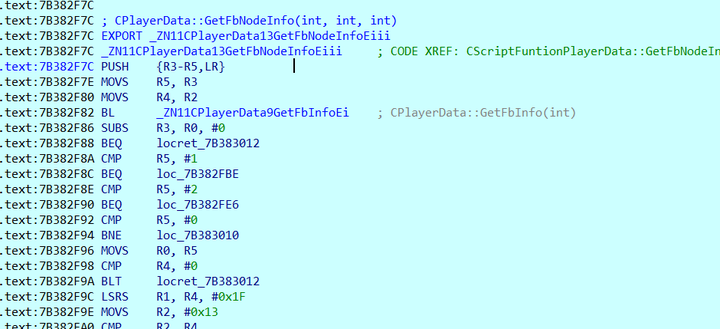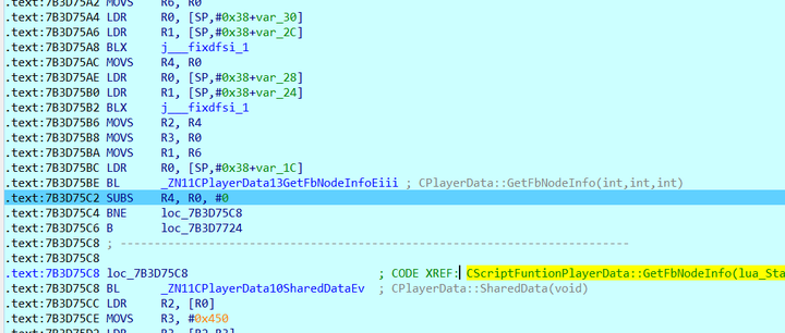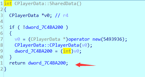 在函数外向上分析,可以很容易的得到r0来源于函数_ZN11CPlayerData10SharedDataEv的返回值,F5对这个函数进行观察,可以得出这个函数是游戏初始化相关的函数,在游戏刚刚启动时会new一个很大的空间来存放初始化信息,之后就不会再经过这片代码,而r0会来源于其内部的一个全局变量(如图)