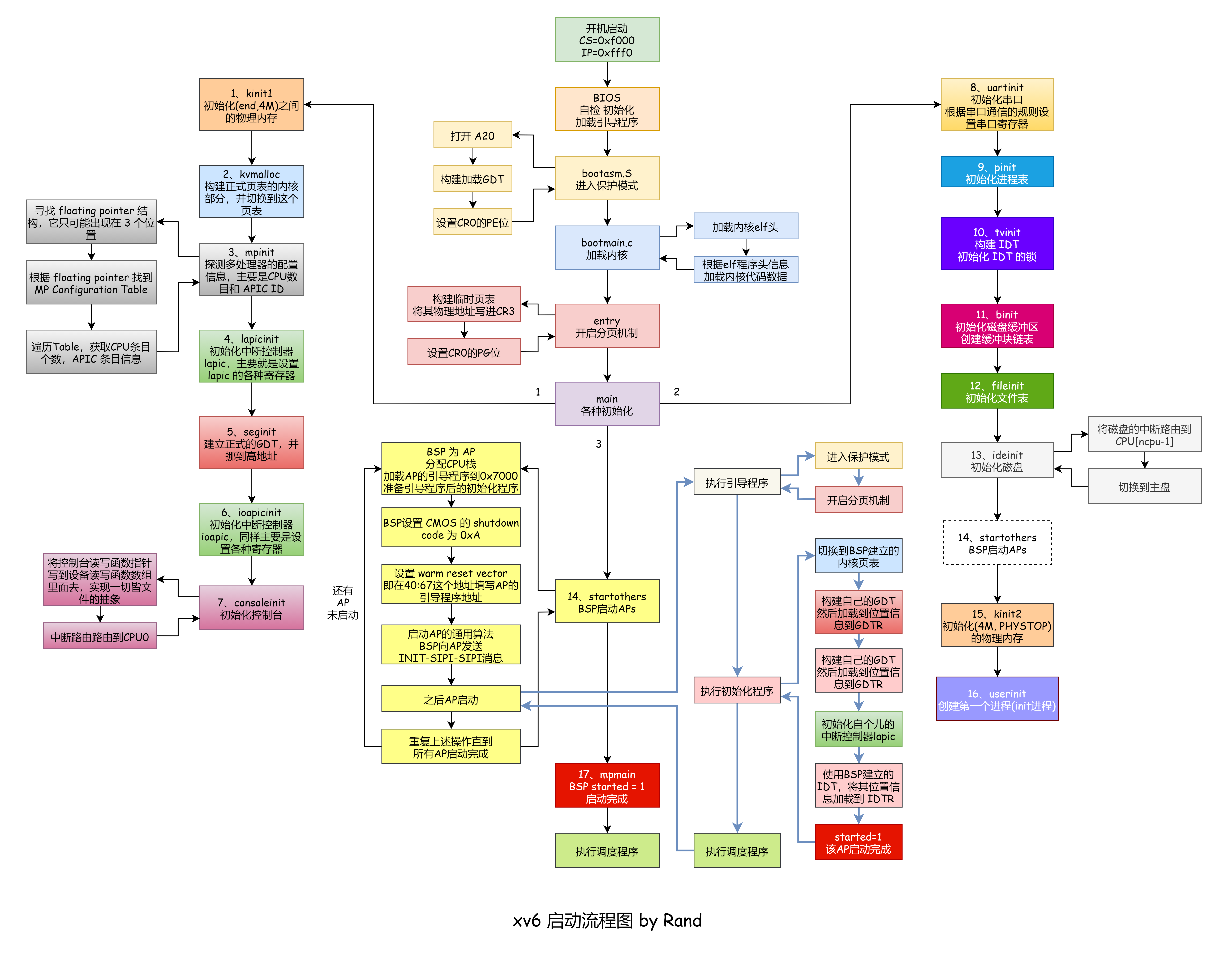计算机启动: x v 6 xv6 xv6 的计算机启动过程与常见的一些启动过程稍稍不同,主要是 M B R MBR MBR 和 B o o t l o a d e r Bootloader Bootloader揉在一起了,其他的没什么,比较常规,可能就是多处理器的情况可能大家不太熟悉,这一块大概有这么一些问题: