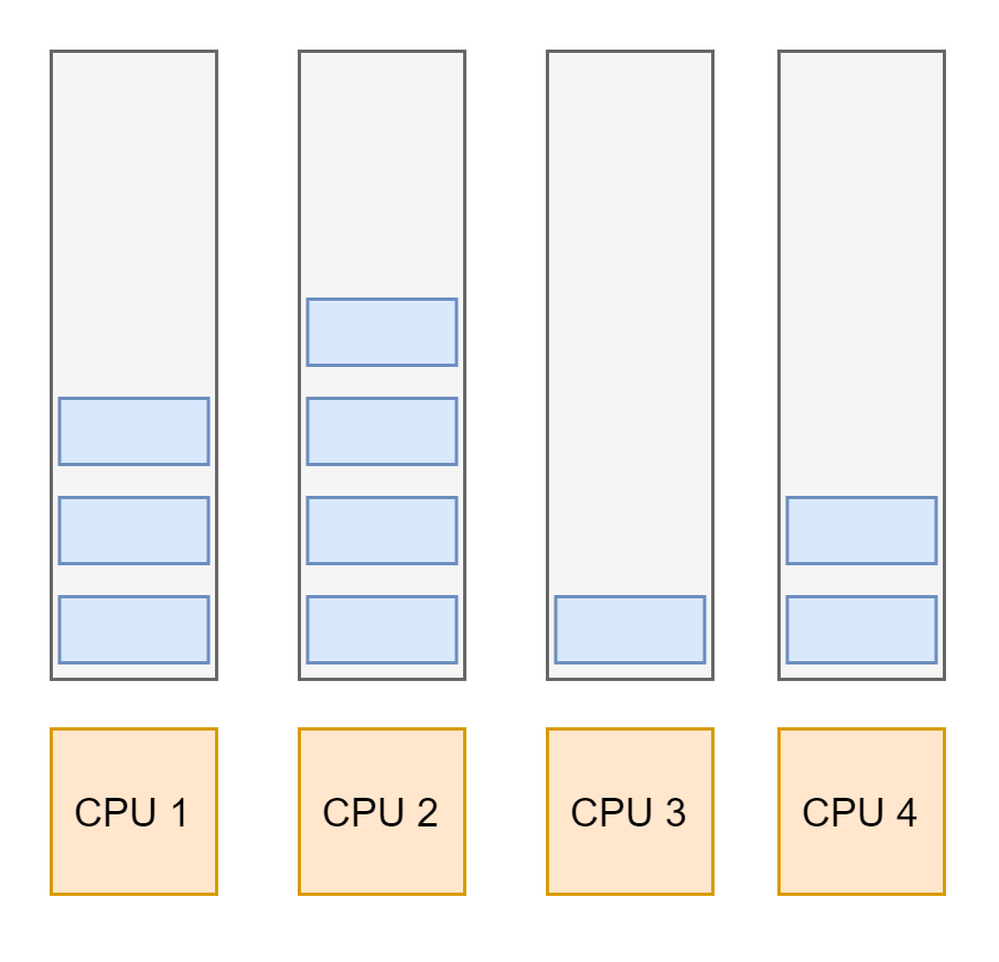 但是也有明显缺点:各个 CPU 的负载不均衡,从上图就可以看出 CPU2 负载较大,而 CPU3 负载较小