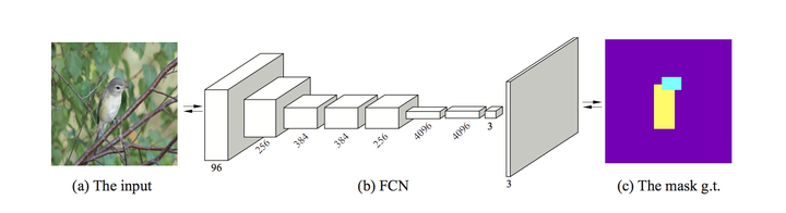 最近,我们也针对细粒度图像分类问题提出了名为Mask-CNN的模型。同上,该模型亦分为两个模块,第一是part localization,第二是全局和局部图像块的特征学习。需要指出的是,与前两个工作的不同在于,在Mask-CNN中,我们提出借助FCN学习一个部位分割模型(part-based segmentation model)。其真实标记是通过part annotation得到的头部和躯干部位的最小外接矩形,如下图(c)所示。在FCN中,part localization这一问题就转化为一个三分类分割问题,其中,一类为头部,一类为躯干,最后一类则是背景。