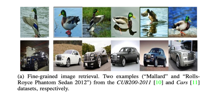 而细粒度图像检索,如图(a),则需要将同为“绿头鸭”的图像从众多不同类鸟类图像中返回;同样,需要将“劳斯莱斯幻影”从包括劳斯莱斯其他车型的不同品牌不同车型的众多图像中检索出来。细粒度图像检索的难点,一是图像粒度非常细微;二是对细粒度图像而言,哪怕是属于同一子类的图像本身也具有形态、姿势、颜色、背景等巨大差异。可以说,细粒度图像检索是图像检索领域和细粒度图像分析领域的一项具有新鲜生命力的研究课题。