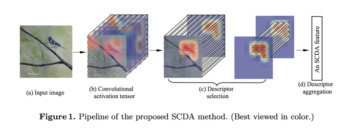 Selective Convolutional Descriptor Aggregation (SCDA) 是我们近期提出的首个基于深度学习的细粒度图像检索方法[9]。同其他深度学习框架下的图像检索工作一样,在SCDA中,细粒度图像作为输入送入pre-trained CNN模型得到卷积特征/全连接特征。区别于传统图像检索的深度学习方法,针对细粒度图像检索问题,我们发现卷积特征优于全连接层特征,同时创新性的提出要对卷积描述子进行选择。不过SCDA与之前提到的Mask-CNN的不同在于,在图像检索问题中,不仅没有精细的part annotation,就连图像级别标记都无从获取。这就要求算法在无监督条件下依然可以完成物体的定位,根据定位结果进行卷积特征描述子的选择。对保留下来的深度特征,分别做以平均和最大池化操作,之后级联组成最终的图像表示。