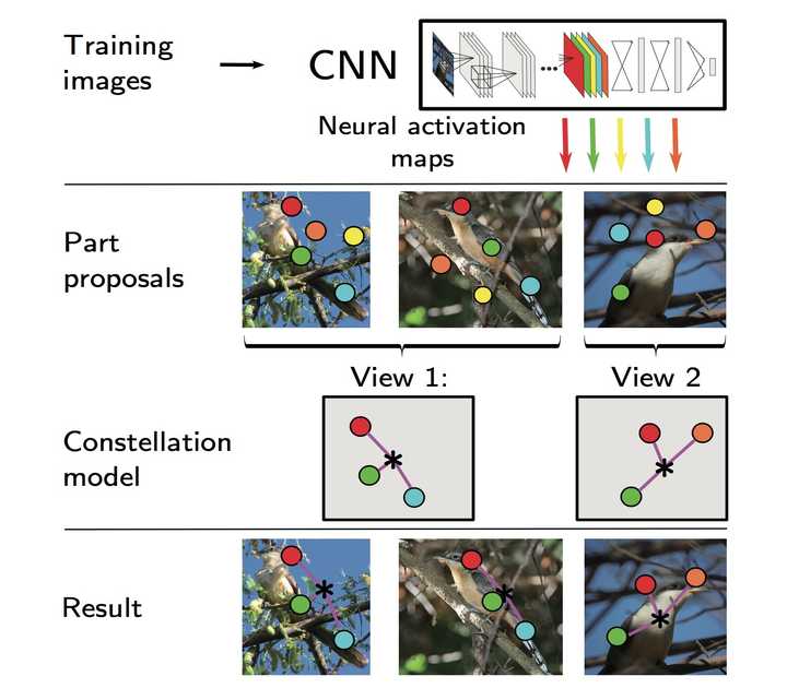 该模型主要分为三个阶段。(1) 预处理模型:从输入图像中产生大量的候选区域,对这些区域进行过滤,保留包含前景物体的候选区域;(2) 物体级模型:训练一个网络实现对对象级图像进行分类。在此需要重点介绍的是(3)局部级模型。我们来看,在不借助part annotation的情况下,该模型怎样做到part检测。