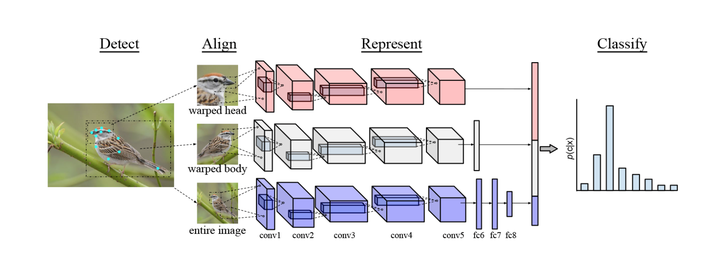 诚如刚才提到,细粒度物体的差异仅体现在细微之处。如何有效地对前景对象进行检测,并从中发现重要的局部区域信息,成为了细粒度图像分类算法要解决的关键问题。对细粒度分类模型,可以按照其使用的监督信息的多少,分为“基于强监督信息的分类模型”和“基于弱监督信息的分类模型”两大类。- 基于强监督信息的细粒度图像分类模型