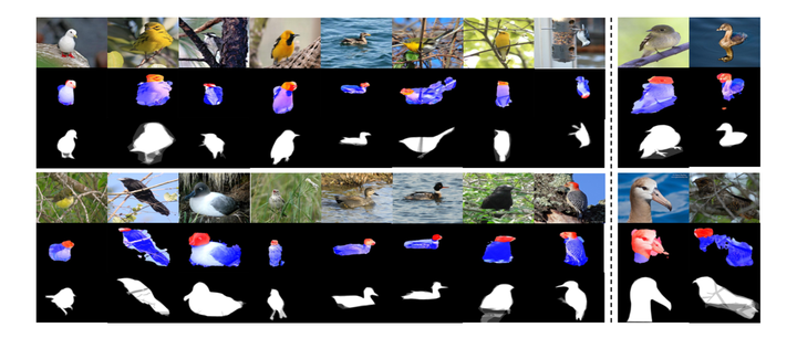 FCN训练完毕后,可以对测试集中的细粒度图像进行较精确地part定位,下图展示了一些定位效果图。可以发现,基于FCN的part定位方式可以对大多数细粒度图像进行较好的头部和躯干定位。同时,还能注意到,即使FCN的真实标记是粗糙的矩形框,但是其预测结果中针对part稍精细些的轮廓也能较好得到。在此,我们称预测得到的part分割结果为part