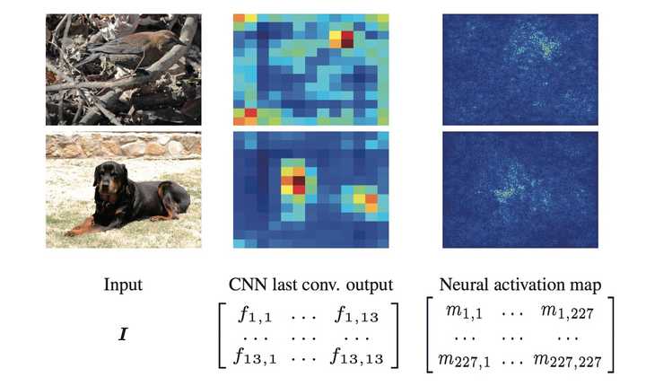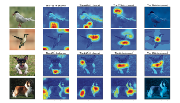 很明显,在SCDA中,最重要的就是如何在无监督条件下对物体进行定位。通过观察得到的卷积层特征(见下图),可以发现明显的“分布式表示”特性[10]。对两种不同鸟类/狗,同一层卷积层的最强响应也差异很大。如此一来,单独选择一层卷积层特征来指导无监督物体定位并不现实,同时全部卷积层特征都拿来帮助定位也不合理。例如,对于第二张鸟的图像来说,第108层卷积层较强响应竟然是一些背景的噪声。