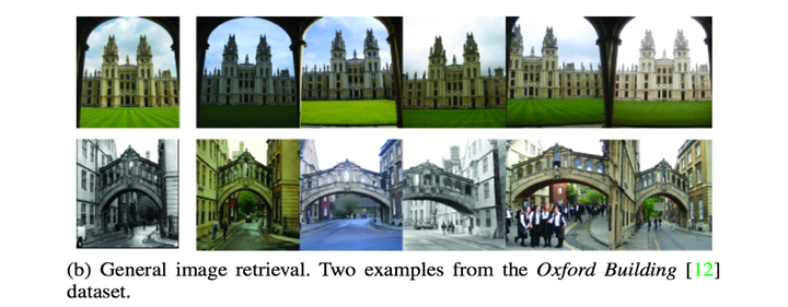 图像检索(image retrieval)按检索信息的形式,分为“以文搜图”(text-based)和“以图搜图”(image-based)。在此我们仅讨论以图搜图的做法。传统图像检索任务一般是检索类似复制的图像(near-duplicated images),如下图(b)所示。左侧单列为query图像,右侧为返回的正确检索结果。可以看到,传统图像检索图像是在不同光照不同时间下同一地点的图像,这类图像不会有形态、颜色、甚至是背景的差异。