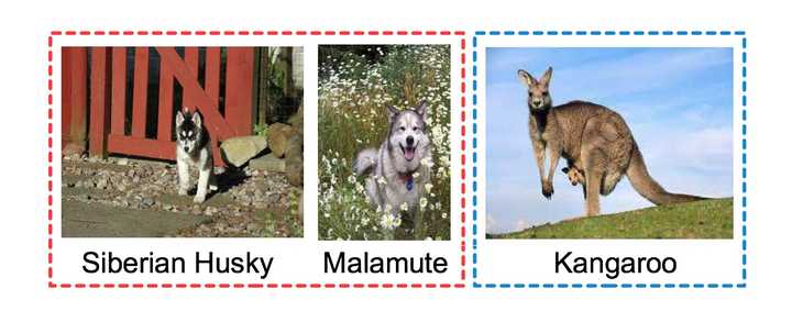 细粒度图像分析任务相对通用图像(general/generic images)任务的区别和难点在于其图像所属类别的粒度更为精细。下图为例,通用图像分类其任务诉求是将“袋鼠”和“狗”这两个物体大类(蓝色框和红色框中物体)分开,可见无论从样貌、形态等方面,二者还是能很容易被区分;而细粒度图像分类任务则要求对“狗”该类类别下细粒度的子类,即分别为“哈士奇”和“爱斯基摩犬”的图像分辨开来。正因同类别物种的不同子类往往仅在耳朵形状、毛色等细微处存在差异,可谓“差之毫厘,谬以千里”。不止对计算机,对普通人来说,细粒度图像任务的难度和挑战无疑也更为巨大。