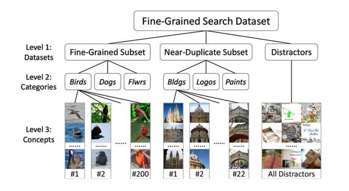 [8]在2015年首次提出细粒度图像“搜索”的概念,通过构造一个层次数据库将多种现有的细粒度图像数据集和传统图像检索(一般为场景)融合。在搜索时,先判断其隶属的大类,后进行细粒度检索。其所用特征仍然是人造图像特征(SIFT等),基于图像特征可以计算两图相似度,从而返回检索结果。