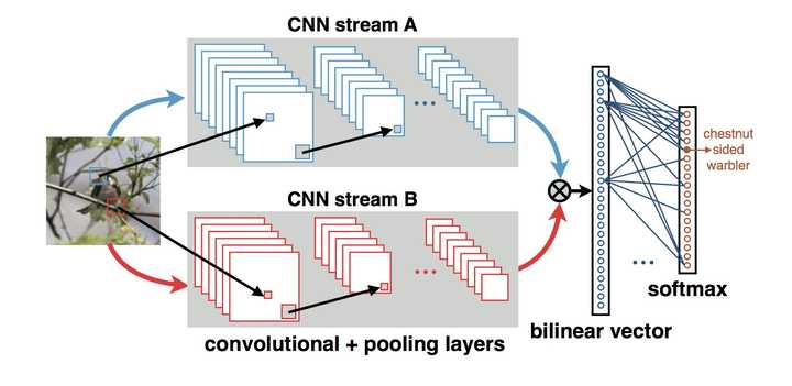 深度学习成功的一个重要精髓,就是将原本分散的处理过程,如特征提取,模型训练等,整合进了一个完整的系统,进行端到端的整体优化训练。不过,在以上所有的工作中,我们所看到的都是将卷积网络当做一个特征提取器,并未从整体上进行考虑。最近,Lin等人[7]设计了一种端到端的网络模型Bilinear CNN,在CUB200-2011数据集上取得了弱监督细粒度分类模型的最好分类准确度。