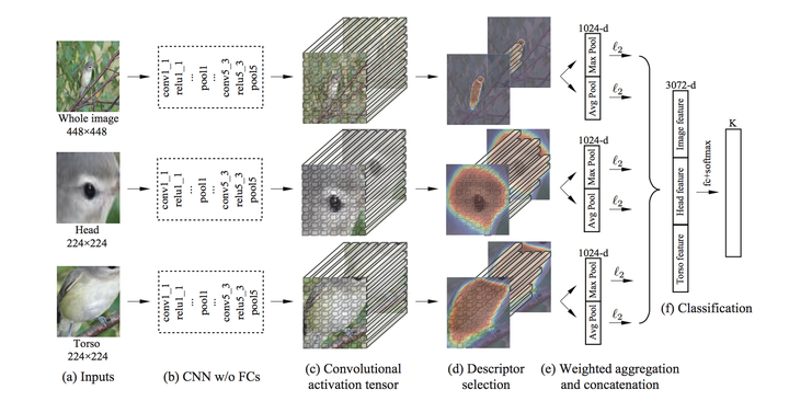在此需要特别指出的是,在每个子网络中,上一步骤中学到的part/object mask还起到了一个关键作用,即「筛选关键卷积特征描述子」(selecting useful convolutional descriptor),如下图(c)-(d)。这个模块也是我们首次在细粒度图像分类中提出的。筛选特征描述子的好处在于,可以保留表示前景的描述子,而去除表示背景的卷积描述子的干扰。筛选后,对保留下来的特征描述子进行全局平均和最大池化(global average/max pooling)操作,后将二者池化后的特征级联作为子网络的特征表示,最后将三个子网特征再次级联作为整张图像的特征表示。