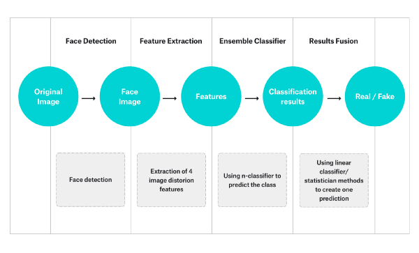 图2. IDA分类过程流程:提取4个失真特征,将它们传递给一组分类器,将结果传递给负责欺骗/非欺骗决策的分类器