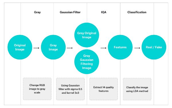 该解决方案基于将原始图像与用高斯滤波处理的图像进行比较。该论文的作者[1]证明了假图像之间的差异与真实图像之间的差异,并且可以自动检测。为了做到这一点,我们提取了14种流行的图像质量特征,例如:均方误差,平均差或边缘/角差。下一步是将它们发送给分类器,以确定它是“真实”的脸还是“假的”脸。