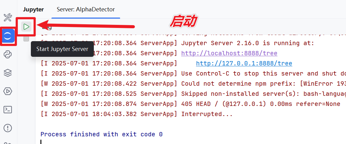 我希望通过 PyCharm 启动 Jupyter Notebook 服务,初始使用如下命令: