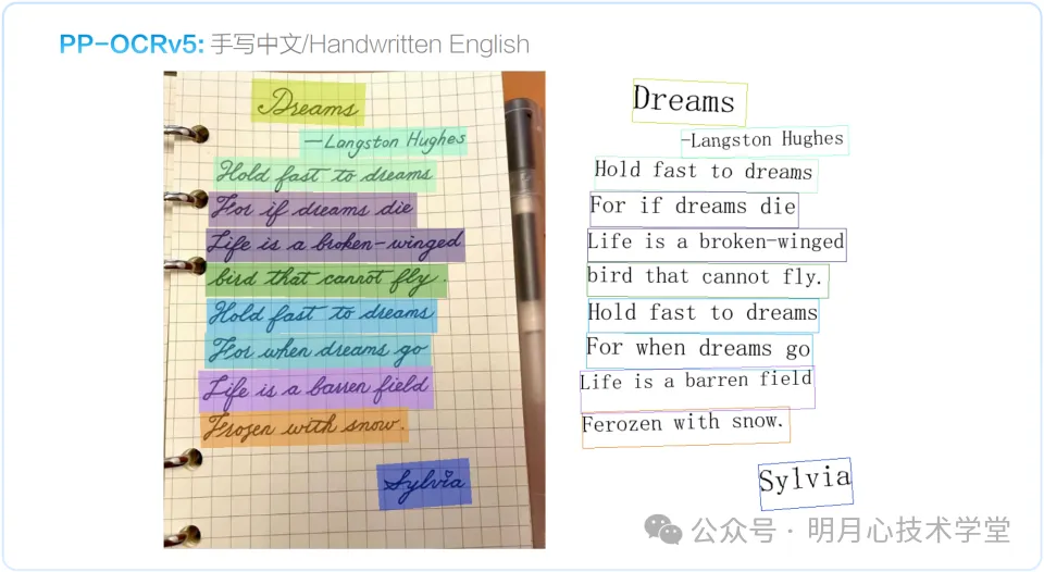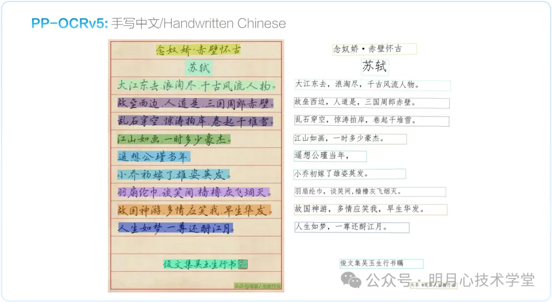 支持复杂手写体识别。手写体混合印刷体的识别是多个应用场景的刚需,例如:教育行业的试卷作业批改场景、医疗行业的病历数字化场景、法律行业的合同笔录数字化场景等。PP-OCRv5支持中英日手写体识别,对复杂连笔、非规范字迹识别精度有显著提升。