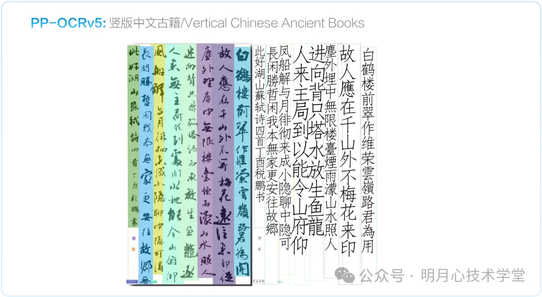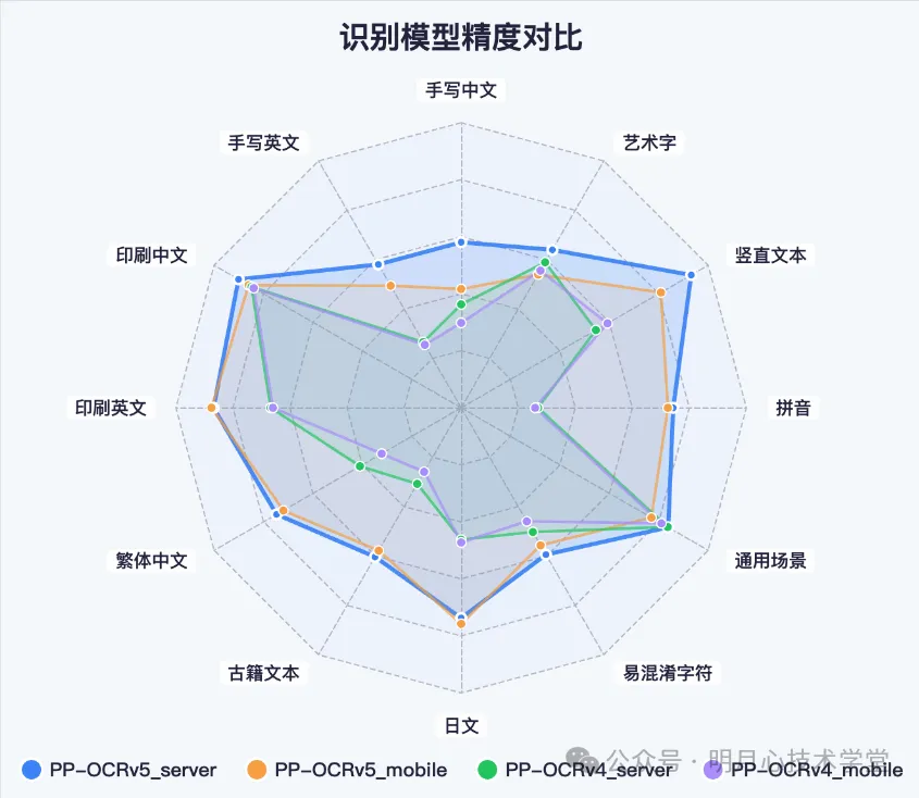 单模型支持5种文字类型(简体中文、繁体中文、中文拼音、英文和日文)。PP-OCRv5是业界首个单模型支持5种文字类型的超轻量级(<100M)开源模型,在此之前,通常是单一模型解决一种文字类型的识别。若一个文档中有3种文字类型,则需要调用三个模型去实现文字识别,导致识别效率不高。PP-OCRv5通过统一模型架构实现5种文字类型的无缝识别,无需针对不同文字类型部署独立模型,简化了部署流程,也提升了识别的总体精度和速度。