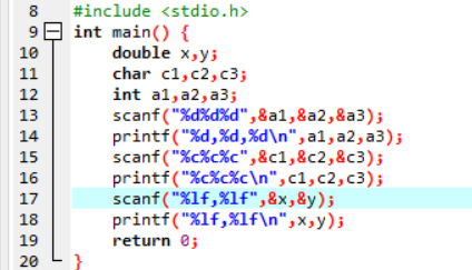 #include <stdio.h> int main() { int x=1234; float f=123.456; double m=123.456; char ch='a'; char a[]="Hello, world!"; // 定义一个数组a,数组中连续存放了字符串常量hello,world! int y=3, z=4; printf("%d %d\n", y, z); printf("y=%d, z=%d\n", y,z); printf("%8d,%2d\n", x,x); printf("%f, %8f, %8.1f, %0.2f, %.2e\n",f,f,f,f,f); printf("%lf\n",m); printf("%3c\n", ch); printf("%s\n%15s\n%10.5s\n%2.5s\n%.3s\n",a,a,a,a,a); return 0; }