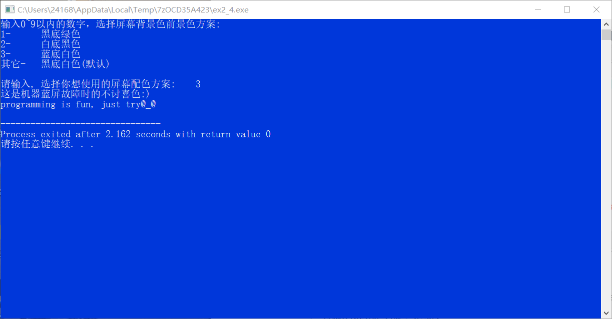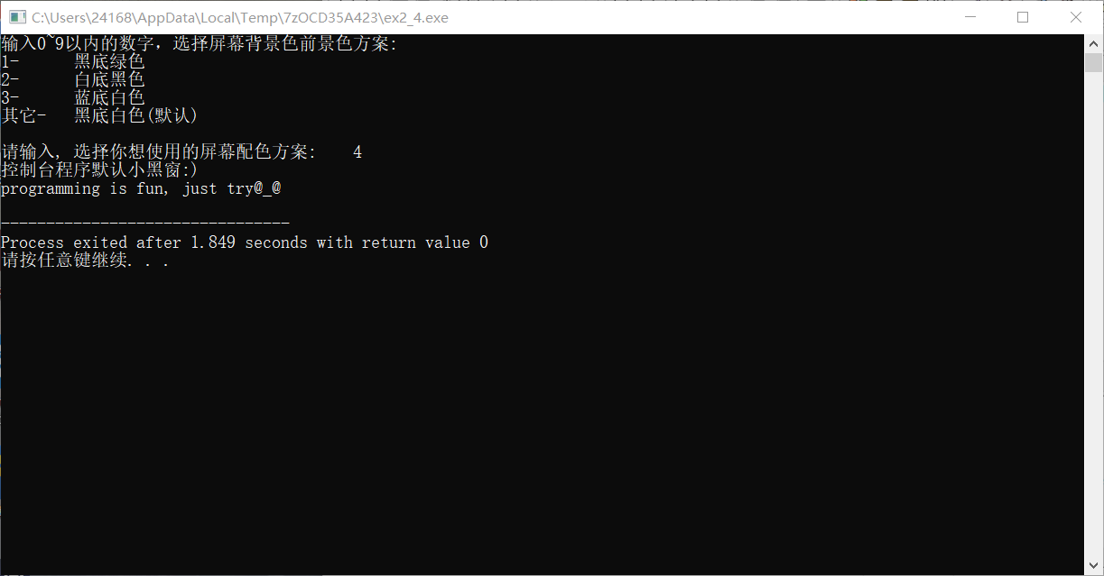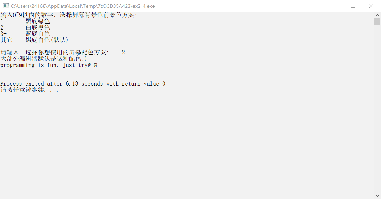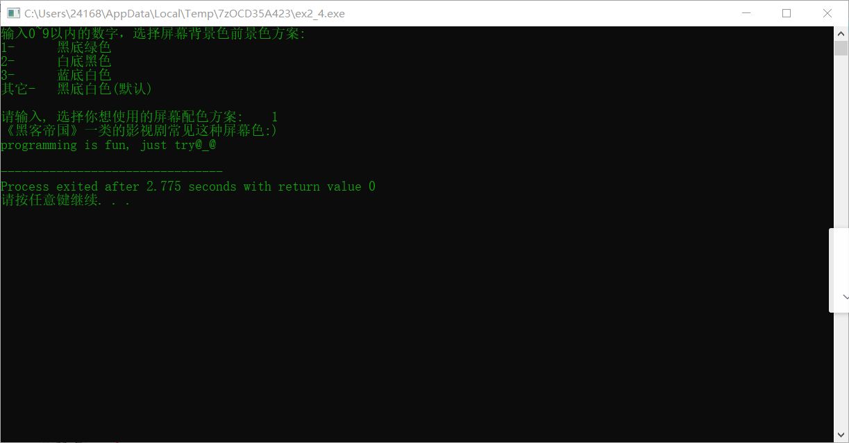#include <stdio.h> #include <stdlib.h> int main() { int choice; // 显示菜单 printf("输入0~9以内的数字,选择屏幕背景色前景色方案: \n"); printf("1-\t黑底绿色\n"); printf("2-\t白底黑色\n"); printf("3-\t蓝底白色\n"); printf("其它-\t黑底白色(默认)\n"); printf("\n请输入, 选择你想使用的屏幕配色方案: "); // 要求用户从键盘输入0~9的数字,选择屏幕配色方案 scanf("%d",&choice); // 根据用户输入,设置屏幕配色方案 if (choice == 1) { system("color 02"); printf("《黑客帝国》一类的影视剧常见这种屏幕色:)\n"); } else if(choice == 2) { system("color f0"); printf("大部分编辑器默认是这种配色:)\n"); } else if(choice == 3) { system("color 1f"); printf("这是机器蓝屏故障时的不讨喜色:)\n"); } else { system("color 0f"); printf("控制台程序默认小黑窗:)\n"); } printf("programming is fun, just try@_@\n"); return 0; }