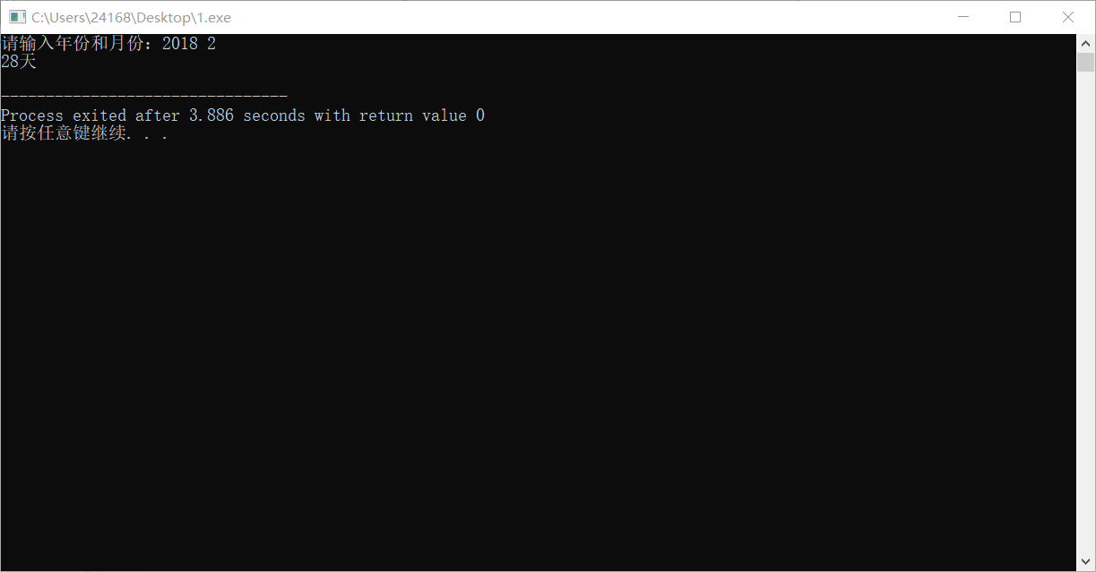#include<stdio.h> int main(){ int a,b; printf("请输入年份和月份:"); scanf("%d%d",&a,&b); if(b==2){ if(a%4==0) printf("29天\n"); else printf("28天\n"); } else { if(b==1||b==3||b==5||b==7||b==8||b==10||b==12) printf("31天\n"); else printf("30天\n"); return 0; } }