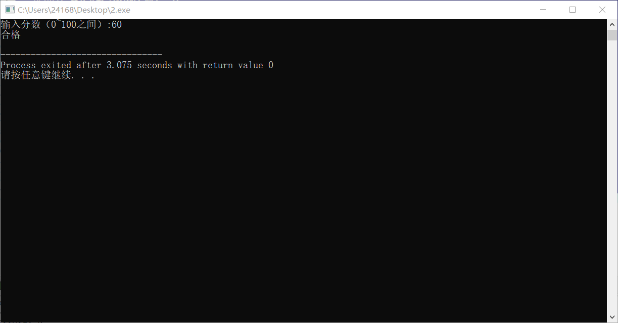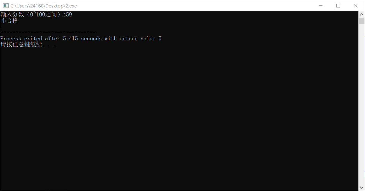 #include<stdio.h> int main(){ int a,b; printf("输入分数(0~100之间):"); scanf("%d",&a); if(a<0||a>100){ printf("分数不在有效区间内\n"); } b=a/10; switch(b){ case 0: case 1: case 2: case 3: case 4: case 5:printf("不合格\n");break; case 6:printf("合格\n");break; case 7:printf("中等\n");break; case 8:printf("良好\n");break; case 9: case 10:printf("优秀\n"); } return 0; }