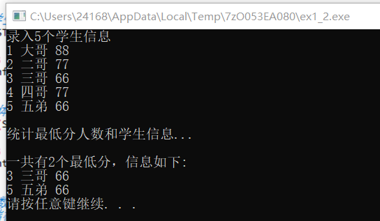 #include <stdio.h> #include <stdlib.h> const int N=5; // 定义结构体类型struct student,并定义STU为其别名 typedef struct student { long no; char name[20]; int score; }STU; // 函数声明 void input(STU s[], int n); int findMinlist(STU s[], STU t[], int n); void output(STU s[], int n); int main() { STU stu[N], minlist[N]; int count; printf("录入%d个学生信息\n", N); input(stu, N); printf("\n统计最低分人数和学生信息...\n"); count = findMinlist(stu, minlist, N); printf("\n一共有%d个最低分,信息如下:\n", count); output(minlist, count); system("pause"); return 0; } // 输入n个学生信息,存放在结构体数组s中 void input(STU s[], int n) { int i; for(i=0; i<n; i++) scanf("%ld %s %d", &s[i].no, s[i].name, &s[i].score); } // 输出结构体s中n个元素信息 void output(STU s[], int n) { int i; for(i=0; i<n; i++) printf("%ld %s %d\n", s[i].no, s[i].name, s[i].score); } // 在结构体数组s中,查找最低分学生的记录,将其存入结构体数组s中 // 形参n是结构体数组s中元素个数 // 函数返回最低分的学生人数 int findMinlist(STU s[], STU t[], int n) { int i,j,k=0;float m; m=s[0].score; for(i=1;i<n;i++) { if(m>s[i].score) m=s[i].score; } for(j=0;j<n;j++) if(s[j].score==m) t[k++]=s[j]; return k; }