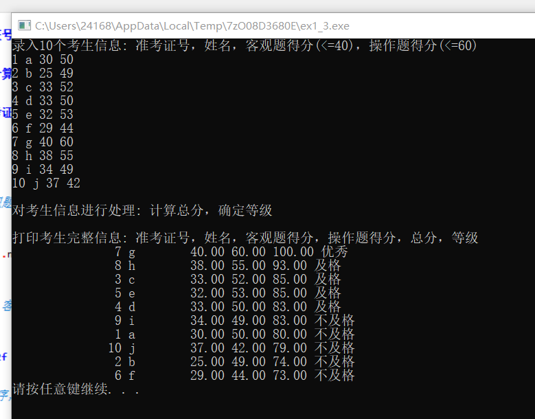 #include <stdio.h> #include <stdlib.h> #include <string.h> const int N = 10; // 定义结构体类型struct student,并定义其别名为STU typedef struct student { long int id; char name[20]; float objective; /*客观题得分*/ float subjective; /*操作题得分*/ float sum; char level[10]; }STU; // 函数声明 void input(STU s[], int n); void output(STU s[], int n); void process(STU s[], int n); int main() { STU stu[N]; printf("录入%d个考生信息: 准考证号,姓名,客观题得分(<=40),操作题得分(<=60)\n", N); input(stu, N); printf("\n对考生信息进行处理: 计算总分,确定等级\n"); process(stu, N); printf("\n打印考生完整信息: 准考证号,姓名,客观题得分,操作题得分,总分,等级\n"); output(stu, N); system("pause"); return 0; } // 录入考生信息:准考证号,姓名,客观题得分,操作题得分 void input(STU s[], int n) { int i; for(i=0; i<n; i++) { scanf("%ld %s %f %f", &s[i].id, s[i].name, &s[i].objective, &s[i].subjective); } } //输出考生完整信息: 准考证号,姓名,客观题得分,操作题得分,总分,等级 void output(STU s[], int n) { int i; for(i=0; i<n; i++) { printf("%16ld %-8s %.2f %.2f %.2f %-8s\n", s[i].id, s[i].name, s[i].objective, s[i].subjective, s[i].sum, s[i].level); }} // 对考生信息进行处理:计算总分,排序,确定等级 void process(STU s[], int n){ int i,j,k,m; student t; for(i=0;i<n;i++) { s[i].sum=(s[i].objective+s[i].subjective); } for(j=0;j<n-1;j++) for(k=0;k<n-1-j;k++) if(s[k].sum<s[k+1].sum) { t=s[k]; s[k]=s[k+1]; s[k+1]=t; } for(m=0;m<n;m++) { if(m<=(int)(0.1*n)-1) strcpy(s[m].level,"优秀"); else if((int)(0.1*n-1)<m&&m<=(int)(0.5*n-1)) strcpy(s[m].level,"及格"); else strcpy(s[m].level,"不及格"); } }