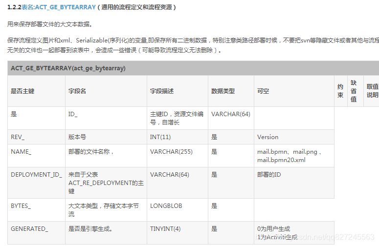 | 一般 数据 | ACT_GE_BYTEARRAY | 通用的流程定义和流程资源 |