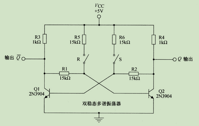 3,由于Q1导通,Q2的B集变为0V截止。此时电路处于稳定状态。