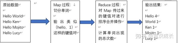可以看到,Map过程会将原始数据转换成类似于(hello,1)这样的<key,value>键值对,然后Reduce过程会对具有相同key的数据进行合并计算。
