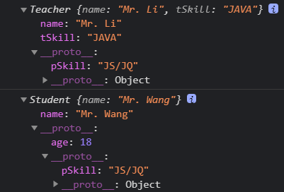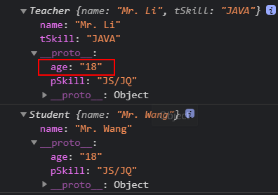 第一种方式:在age = 18 赋值的时候,由于Student的原型是拿的Teacher原型的地址引用,所以修改Student的原型,那么Teacher的原型也会跟着一起改。
