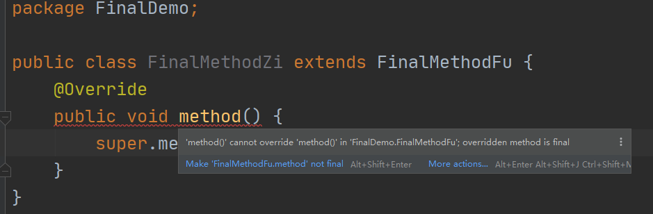 package FinalDemo; public class FinalMethodFu { public final void method(){ System.out.println("final修饰一个成员方法"); } }