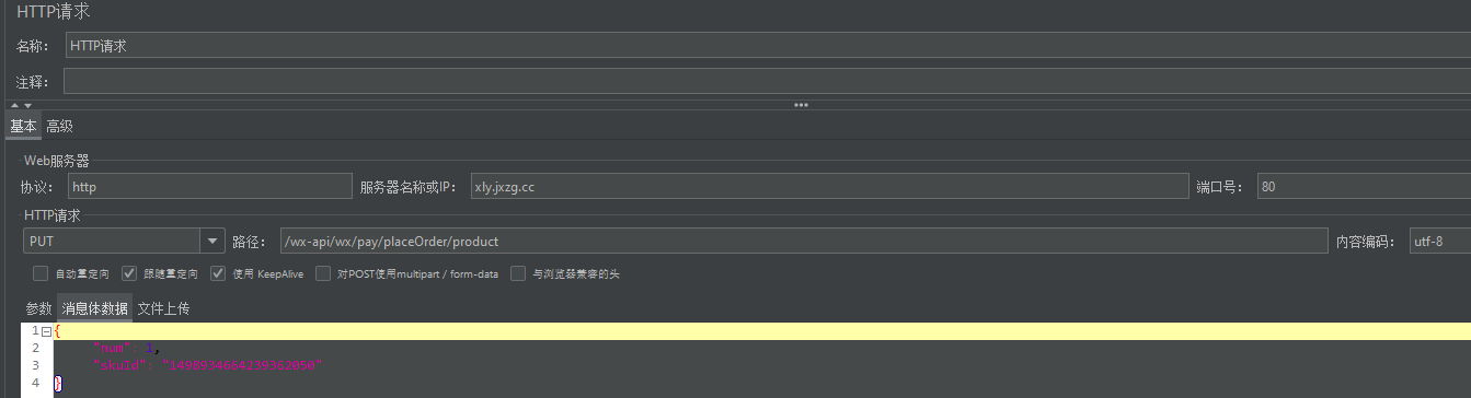 我这里使用body json方式提交参数 所以使用消息体数据配置参数