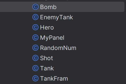 我方坦克类Hero与敌方坦克类EnemyTank均从父类Tank继承,此外还有射击类Shot表示敌我双方坦克发射的子弹,随机数类RandomNum表示敌方坦克的随即移动,Bomb类表示敌方坦克被击中后的爆炸效果,