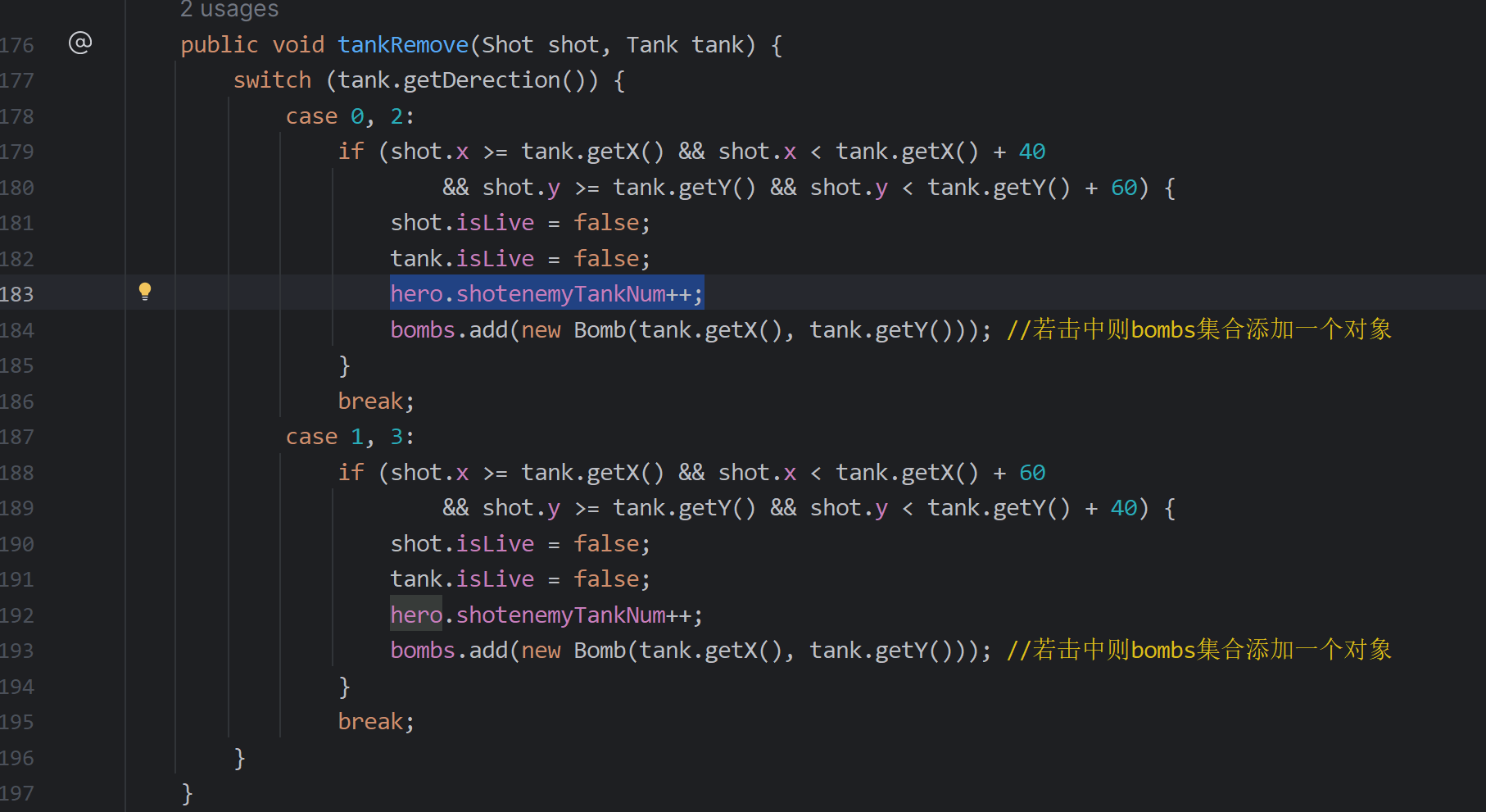 bombs.add(new Bomb(tank.getX(), tank.getY())); //若击中则bombs集合添加一个对象