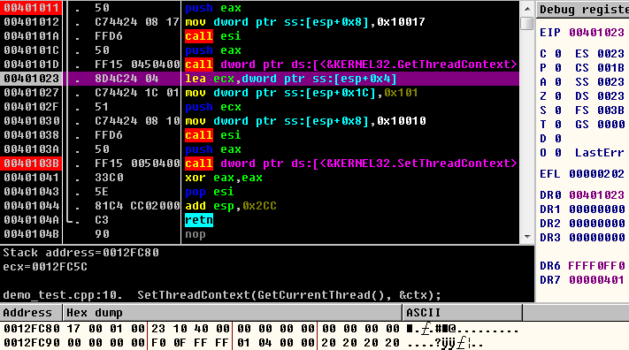 本来Od设置了DR0为0x00401041,而被调试程序调用SetThreadContext,将DR0设置成了局部变量ctx中的内容,即0x00401023。