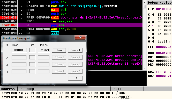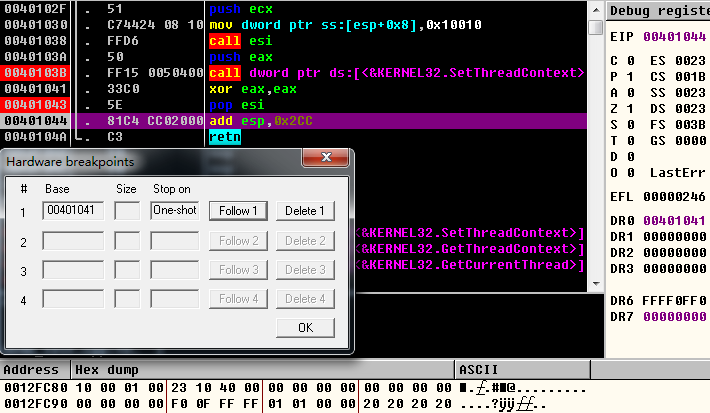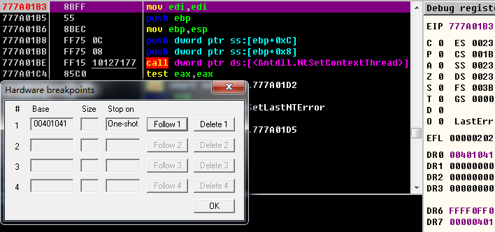 在call SetThreadContext按F8时,根据前面所述原理,Od会在下一条指令即0x00401041处设硬件断点,以期望程序运行到那里断下来。